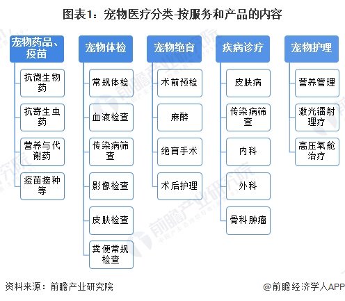根据宠物医疗服务的内容,可将宠物医疗行业分为宠物药品及疫苗、宠物体检、宠物绝育、疾病诊疗及宠物护理五大类。