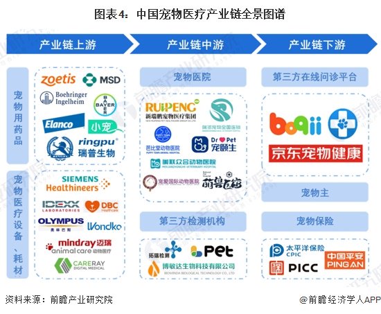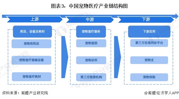 从产业链环节来看,宠物医疗行业上游包括宠物用药品、宠物医疗器械设备以及宠物医疗耗材,中游包括宠物医院、宠物诊所和第三方检测机构,下游包括第三方在线问诊平台、宠物主和宠物医疗保险。