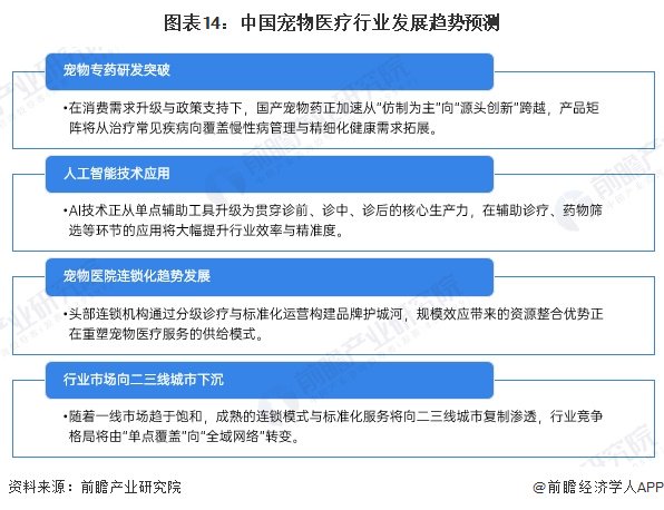 中国宠物医疗行业正处在从“以人为模板”的跟随式发展向“以宠物为中心”的系统性创新转型的关键阶段。受消费需求分化与技术迭代的双重驱动,行业呈现出产品研发精细化、诊疗手段智能化、服务模式集约化以及市场空间梯度化四大核心趋势。从药物研发到临床诊断,从连锁经营到区域拓展,产业链各环节均通过技术赋能与模式创新,推动行业从粗放增长向高质量发展演进。