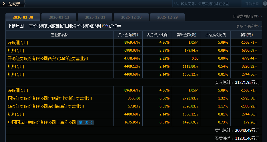 广联航空(300900)今日20cm涨停,成交额20.57亿元,换手率22.89%,盘后龙虎榜数据显示,深股通专用席位买入8969.47万元并卖出1.05亿元,3家机构专用席位净买入1.28亿元。