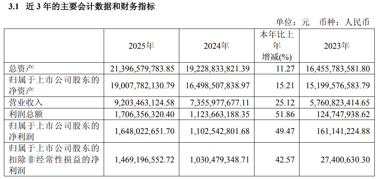公司2025年全年实现营业收入92.03亿元,同比增长25.12%;归属于上市公司股东的净利润16.48亿元,同比增长49.47%;扣除非经常性损益后净利润14.69亿元,同比增长42.57%。利润增速显著快于营收增速,盈利质量明显改善。
