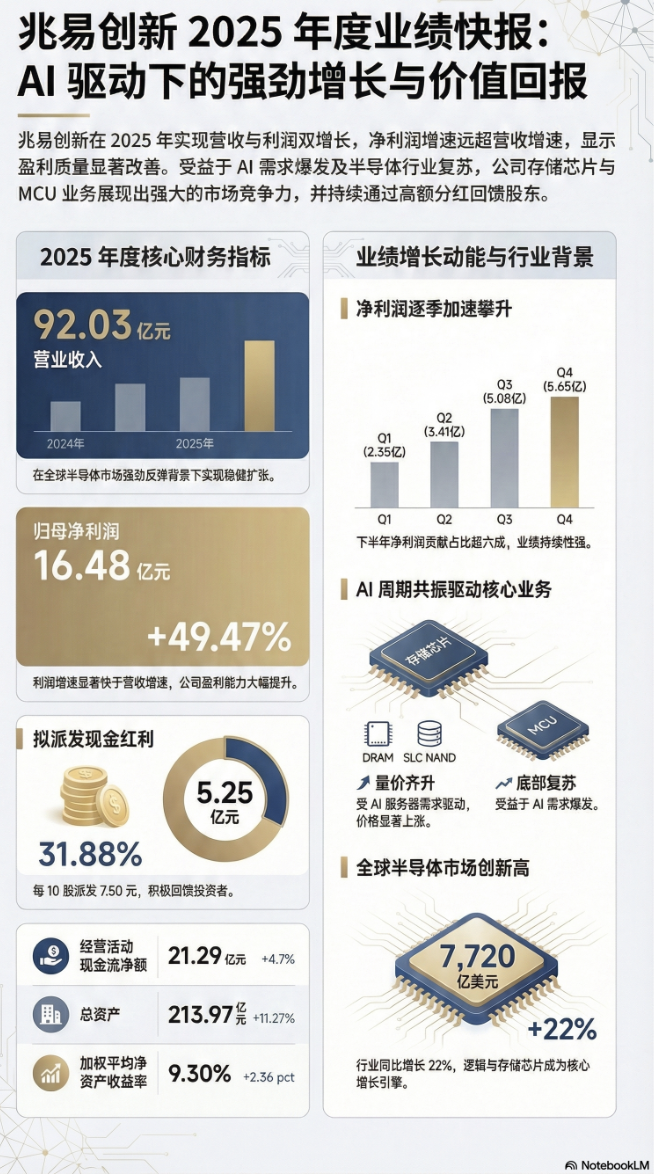 兆易创新交出了一份强劲的年度成绩单。受益于AI需求爆发驱动的半导体行业全面复苏,公司2025年营收与利润均实现大幅增长,并宣布向股东派发逾5.25亿元现金股利。