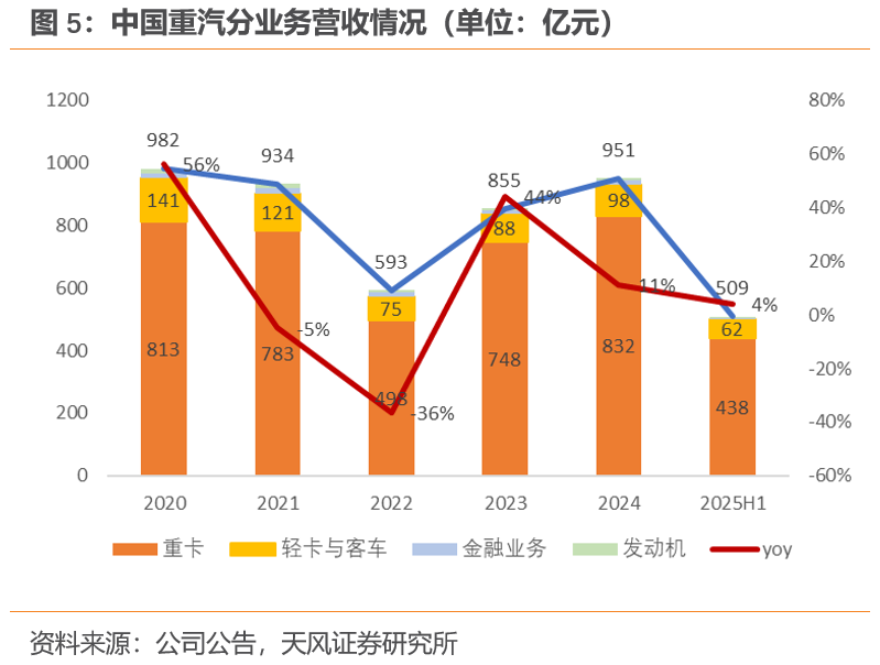 预计 2025-2027 年营收 1139、1246、1371 亿元(YoY+20%、+9%、+10%),归母净利润 68.3、79.1、90.8 亿元(YoY+17%、+16%、+15%);重卡业务为核心营收增长引擎,2025-2027 营收 1011、1109、1227 亿元(YoY+22%、+10%、+11%)。