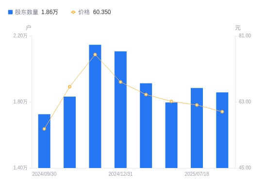 8月6日消息,数据显示,截至2025年7月31日,亚康股份A股股东总户数为1.86万户,较上期(2025年7月18日)减少259户,降幅1.37%。公司最新A股总股本为8677.57万股,其中流通A股5891.17万股,户均持有流通A股数量为3170.02股,较上期增加43.57股,增幅1.39%;户均持流通A股市值19.13万元,较上期减少3091.81元,降幅1.59%。