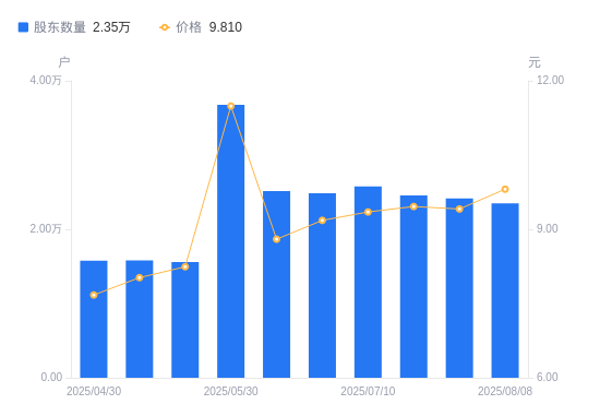 近一年(2024年8月9日至2025年8月8日),汇金通A股股东户数从1.77万户,增加至2.35万户,增幅32.62%,区间股价上涨47.67%。