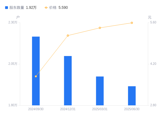 8月15日消息,数据显示,截至2025年6月30日,国发股份A股股东总户数为1.92万户,较上期(2025年3月31日)减少590户,降幅2.99%。公司最新A股总股本为5.24亿股,其中流通A股5.24亿股,户均持有流通A股数量为2.74万股,较上期增加817.81股,增幅3.08%;户均持流通A股市值15.3万元,较上期增加9085.02元,增幅6.31%。