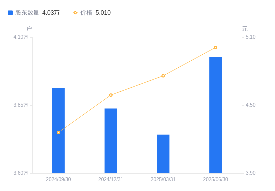 8月21日消息,数据显示,截至2025年6月30日,富春环保A股股东总户数为4.03万户,较上期(2025年3月31日)增加2859户,增幅7.64%。公司最新A股总股本为8.65亿股,其中流通A股8.63亿股,户均持有流通A股数量为2.14万股,较上期减少1637.03股,降幅7.10%;户均持流通A股市值10.73万元,较上期减少2435.56元,降幅2.22%。