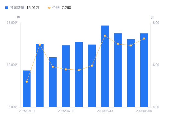 近一年(2024年8月20日至2025年8月8日),天海防务A股股东户数从10.45万户,增加至15.01万户,增幅43.68%,区间股价上涨96.22%。