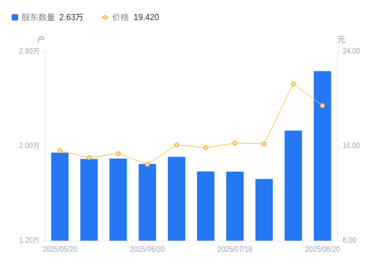 8月21日消息,数据显示,截至2025年8月20日,德恩精工A股股东总户数为2.63万户,较上期(2025年8月8日)增加5035户,增幅23.63%。公司最新A股总股本为1.47亿股,其中流通A股1.08亿股,户均持有流通A股数量为4081.8股,较上期减少964.42股,降幅19.11%;户均持流通A股市值7.93万元,较上期减少2.8万元,降幅26.11%。
