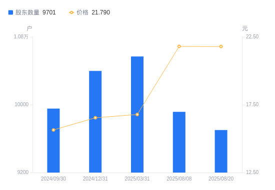 近一年(2024年9月30日至2025年8月20日),农心科技A股股东户数从9954户,减低至9701户,降幅2.54%,区间股价上涨50.38%。