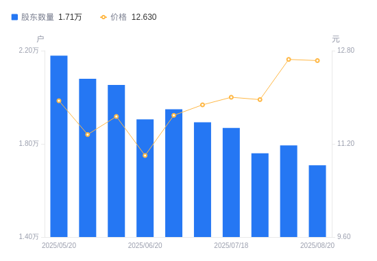 8月21日消息,数据显示,截至2025年7月10日,宏达高科A股股东总户数为1.89万户,较上期(2025年6月30日)减少555户,降幅2.85%。公司最新A股总股本为1.77亿股,其中流通A股1.38亿股,户均持有流通A股数量为7271.61股,较上期增加207.13股,增幅2.93%;户均持流通A股市值8.63万元,较上期增加3730.25元,增幅4.52%。
