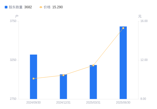 近一年(2024年6月30日至2025年6月30日),奥福科技A股股东户数从3693户,减低至3682户,降幅0.30%,区间股价上涨66.20%。