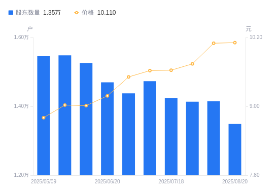 8月22日消息,数据显示,截至2025年8月20日,福建金森A股股东总户数为1.35万户,较上期(2025年8月8日)减少657户,降幅4.64%。公司最新A股总股本为2.36亿股,其中流通A股2.36亿股,户均持有流通A股数量为1.75万股,较上期增加811.62股,增幅4.87%;户均持流通A股市值17.67万元,较上期增加8372.11元,增幅4.97%。
