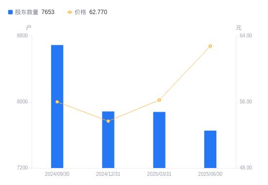 8月25日消息,数据显示,截至2025年6月30日,双元科技A股股东总户数为7653户,较上期(2025年3月31日)减少226户,降幅2.87%。公司最新A股总股本为5914.27万股,其中流通A股1914.27万股,户均持有流通A股数量为2501.33股,较上期增加132.24股,增幅5.58%;户均持流通A股市值15.7万元,较上期增加2.38万元,增幅17.87%。