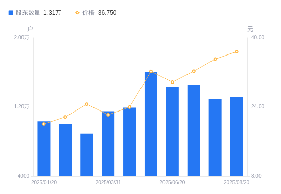 近一年(2024年6月30日至2025年6月30日),润贝航科A股股东户数从1.06万户,增加至1.46万户,增幅37.30%,区间股价上涨48.99%。