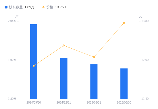 近一年(2024年6月30日至2025年6月30日),戎美股份A股股东户数从2.09万户,减低至1.89万户,降幅9.54%,区间股价上涨33.70%。