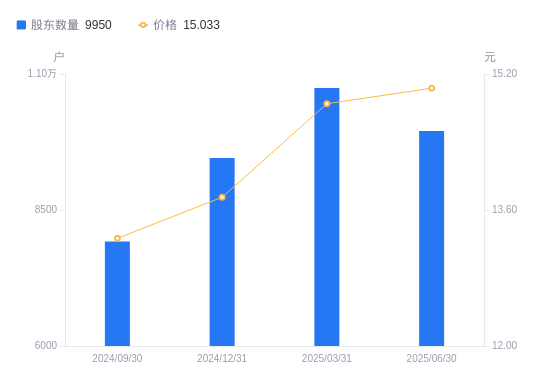 8月25日消息,数据显示,截至2025年6月30日,常润股份A股股东总户数为9950户,较上期(2025年3月31日)减少791户,降幅7.36%。公司最新A股总股本为1.58亿股,其中流通A股6475.93万股,户均持有流通A股数量为6508.48股,较上期增加479.3股,增幅7.95%;户均持流通A股市值9.78万元,较上期增加8308.72元,增幅9.28%。