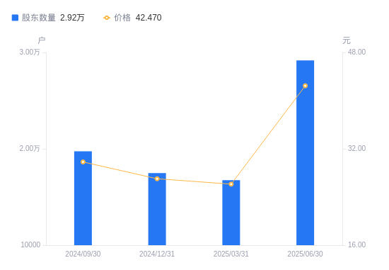 8月26日消息,数据显示,截至2025年6月30日,天箭科技A股股东总户数为2.92万户,较上期(2025年3月31日)增加1.24万户,增幅74.17%。公司最新A股总股本为1.2亿股,其中流通A股6662.02万股,户均持有流通A股数量为2283股,较上期减少1693.38股,降幅42.59%;户均持流通A股市值9.7万元,较上期减少6983.48元,降幅6.72%。