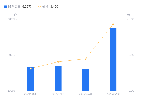 8月26日消息,数据显示,截至2025年6月30日,华纺股份A股股东总户数为6.29万户,较上期(2025年3月31日)增加3.48万户,增幅123.69%。公司最新A股总股本为6.3亿股,其中流通A股6.3亿股,户均持有流通A股数量为1万股,较上期减少1.24万股,降幅55.29%;户均持流通A股市值3.49万元,较上期减少2.6万元,降幅42.64%。