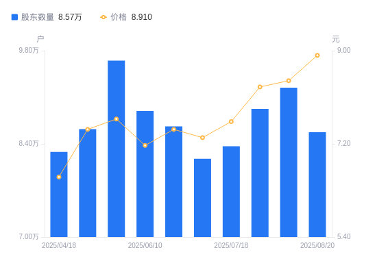 近一年(2024年8月30日至2025年8月20日),远东传动A股股东户数从6.72万户,增加至8.57万户,增幅27.59%,区间股价上涨84.85%。