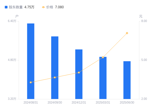 近一年(2024年6月30日至2025年6月30日),ST证通A股股东户数从6.31万户,减低至4.75万户,降幅24.60%,区间股价上涨110.09%。