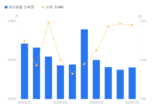 近一年(2024年6月30日至2025年6月30日),安居宝A股股东户数从2.63万户,减低至2.41万户,降幅8.33%,区间股价上涨43.84%。