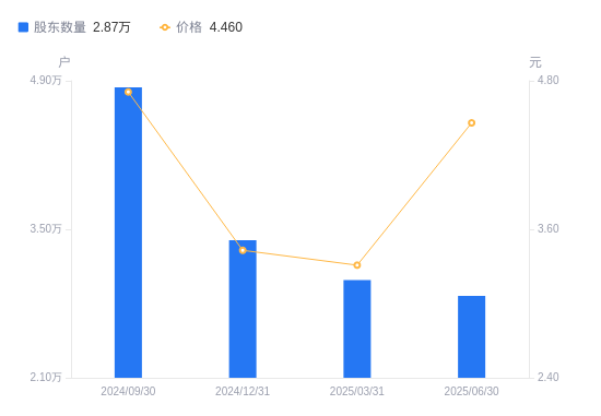 近一年(2024年6月30日至2025年6月30日),ST新亚A股股东户数从3.43万户,减低至2.87万户,降幅16.27%,区间股价上涨41.59%。