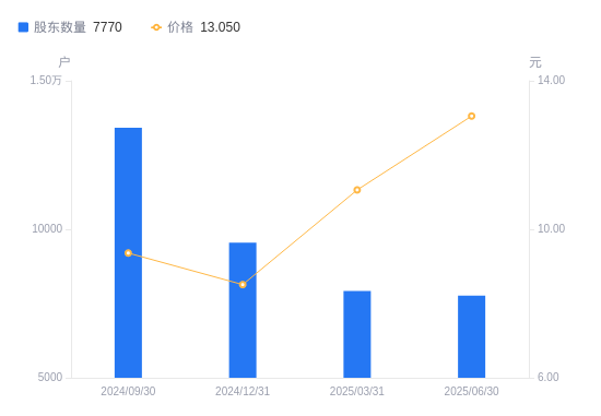 近一年(2024年6月30日至2025年6月30日),南都物业A股股东户数从1.22万户,减低至7770户,降幅36.13%,区间股价上涨55.73%。