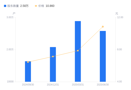 8月26日消息,数据显示,截至2025年6月30日,锦鸡股份A股股东总户数为2.58万户,较上期(2025年3月31日)减少3069户,降幅10.63%。公司最新A股总股本为4.69亿股,其中流通A股3.73亿股,户均持有流通A股数量为1.44万股,较上期增加1536.45股,增幅11.90%;户均持流通A股市值15.69万元,较上期增加5.53万元,增幅54.41%。