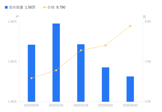 近一年(2024年6月30日至2025年6月30日),快意电梯A股股东户数从1.78万户,减低至1.56万户,降幅12.68%,区间股价上涨46.74%。