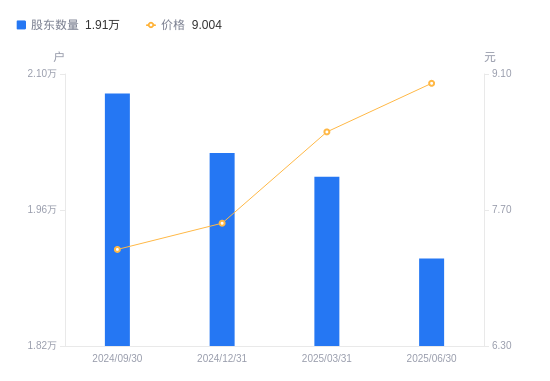 8月27日消息,数据显示,截至2025年6月30日,爱普股份A股股东总户数为1.91万户,较上期(2025年3月31日)减少839户,降幅4.21%。公司最新A股总股本为3.83亿股,其中流通A股3.83亿股,户均持有流通A股数量为2.01万股,较上期增加844.12股,增幅4.39%;户均持流通A股市值18.06万元,较上期增加1.72万元,增幅10.53%。