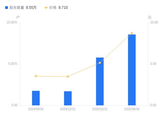 近一年(2024年6月30日至2025年6月30日),尤夫股份A股股东户数从1.8万户,增加至8.55万户,增幅374.91%,区间股价上涨182.79%。