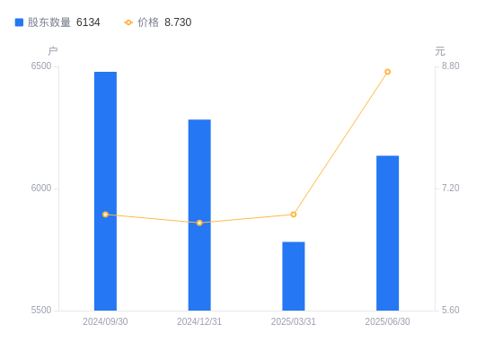 近一年(2024年6月30日至2025年6月30日),元琛科技A股股东户数从6805户,减低至6134户,降幅9.86%,区间股价上涨45.50%。