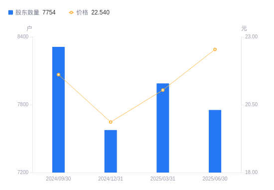 8月28日消息,数据显示,截至2025年6月30日,浙矿股份A股股东总户数为7754户,较上期(2025年3月31日)减少235户,降幅2.94%。公司最新A股总股本为1亿股,其中流通A股7058.28万股,户均持有流通A股数量为9102.76股,较上期增加267.78股,增幅3.03%;户均持流通A股市值20.52万元,较上期增加1.93万元,增幅10.38%。