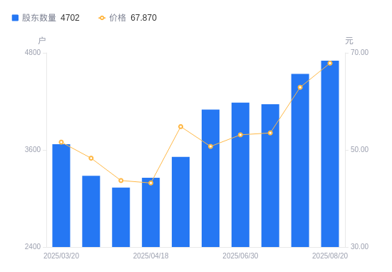 近一年(2024年8月9日至2025年8月8日),菱电电控A股股东户数从3680户,增加至4539户,增幅23.34%,区间股价上涨82.58%。