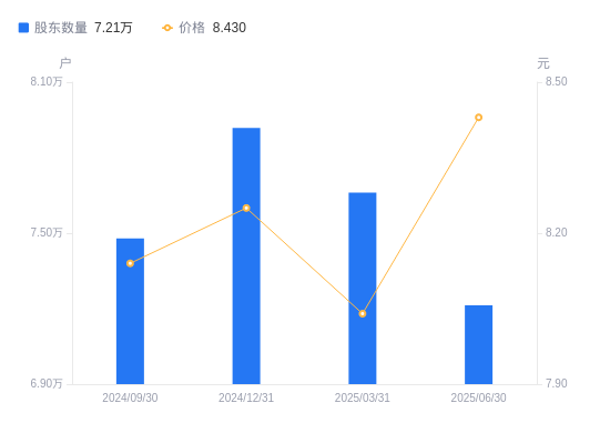 8月29日消息,数据显示,截至2025年6月30日,中体产业A股股东总户数为7.21万户,较上期(2025年3月31日)减少4474户,降幅5.84%。公司最新A股总股本为9.6亿股,其中流通A股9.6亿股,户均持有流通A股数量为1.33万股,较上期增加776.9股,增幅6.20%;户均持流通A股市值11.21万元,较上期增加1.14万元,增幅11.35%。