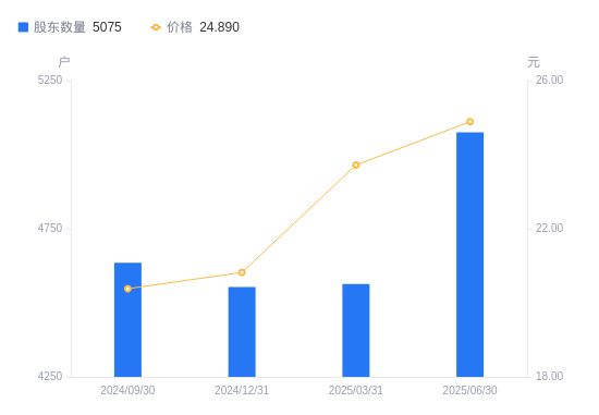 8月29日消息,数据显示,截至2025年6月30日,佳华科技A股股东总户数为5075户,较上期(2025年3月31日)增加512户,增幅11.22%。公司最新A股总股本为7733.4万股,其中流通A股7733.4万股,户均持有流通A股数量为1.52万股,较上期减少1709.83股,降幅10.09%;户均持流通A股市值37.93万元,较上期减少2.27万元,降幅5.65%。