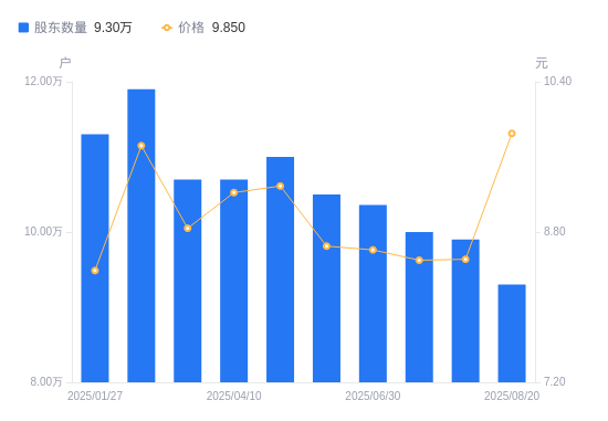 近一年(2024年9月30日至2025年8月20日),西安饮食A股股东户数从11.64万户,减低至9.3万户,降幅20.09%,区间股价上涨20.27%。
