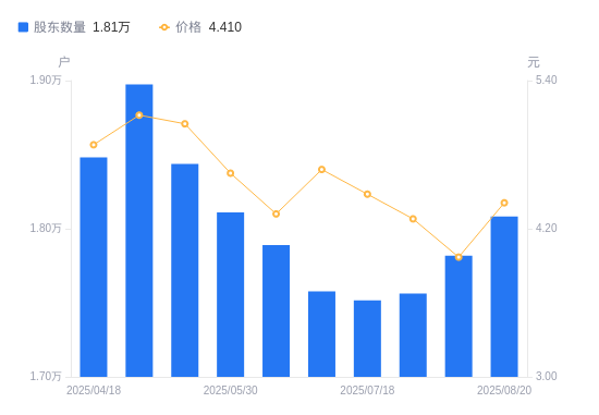 近一年(2024年9月30日至2025年8月20日),ST宁科A股股东户数从2.88万户,减低至1.81万户,降幅37.23%,区间股价上涨114.08%。