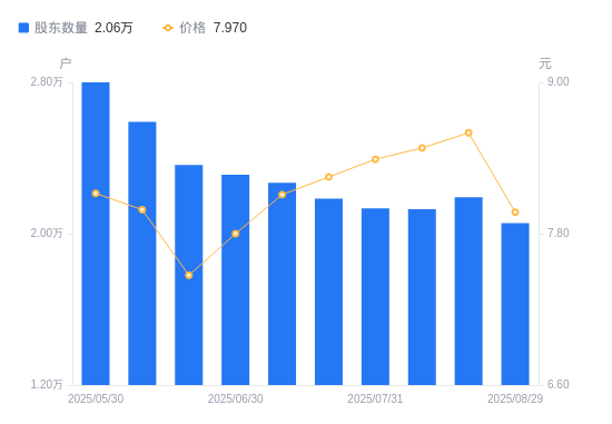 近一年(2024年9月10日至2025年8月29日),益盛药业A股股东户数从2.31万户,减低至2.06万户,降幅10.97%,区间股价上涨32.39%。