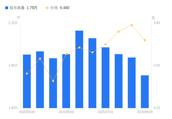 近一年(2024年9月30日至2025年8月29日),龙利得A股股东户数从1.99万户,减低至1.79万户,降幅10.09%,区间股价上涨44.00%。