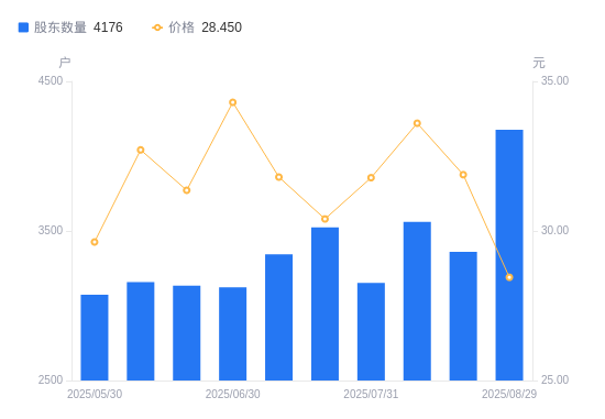 近一年(2024年8月30日至2025年8月29日),大地海洋A股股东户数从3154户,增加至4176户,增幅32.40%,区间股价上涨111.62%。