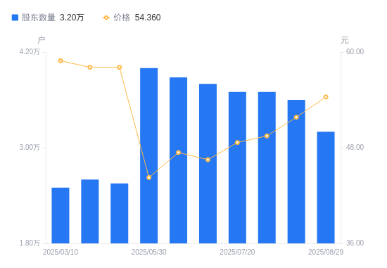 近一年(2024年8月30日至2025年8月29日),浙江鼎力A股股东户数从1.9万户,增加至3.2万户,增幅68.42%,区间股价上涨17.10%。