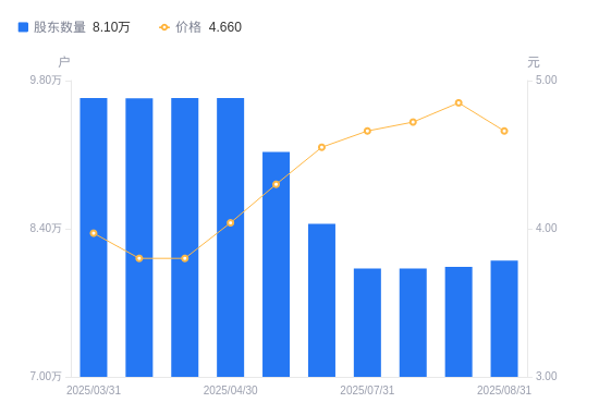 近一年(2024年8月31日至2025年8月31日),宝新能源A股股东户数从8.86万户,减低至8.1万户,降幅8.54%,区间股价上涨17.38%。
