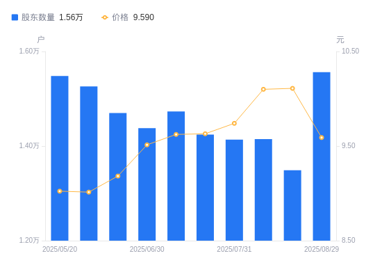 近一年(2024年8月30日至2025年8月29日),福建金森A股股东户数从1.78万户,减低至1.56万户,降幅12.59%,区间股价上涨44.15%。