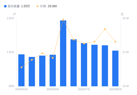 近一年(2024年9月30日至2025年8月29日),锋尚文化A股股东户数从1.3万户,增加至1.55万户,增幅19.02%,区间股价上涨24.76%。