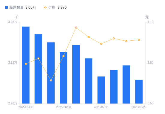 近一年(2024年8月30日至2025年8月29日),亚厦股份A股股东户数从3.23万户,减低至3.05万户,降幅5.38%,区间股价上涨30.51%。