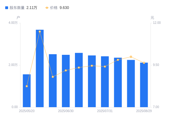 近一年(2024年8月30日至2025年8月29日),汇金通A股股东户数从1.76万户,增加至2.11万户,增幅19.87%,区间股价上涨45.84%。