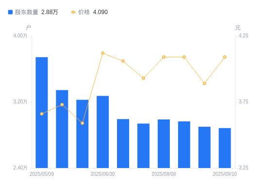 近一年(2024年9月10日至2025年9月10日),三木集团A股股东户数从3.08万户,减低至2.88万户,降幅6.23%,区间股价上涨58.53%。