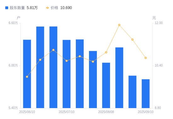 近一年(2024年9月10日至2025年9月10日),银邦股份A股股东户数从4.9万户,增加至5.81万户,增幅18.48%,区间股价上涨35.49%。